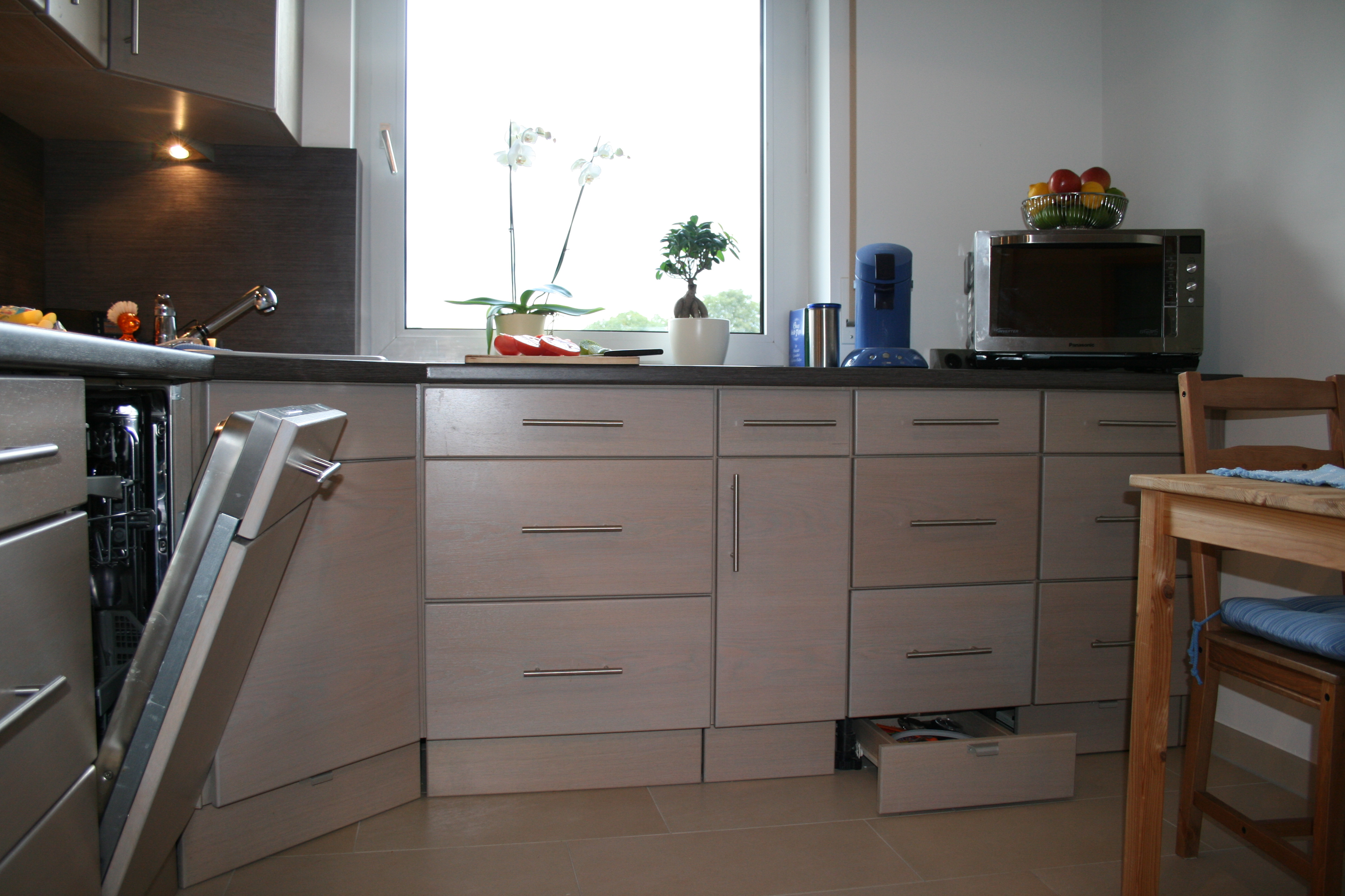 Blick auf moderne Küche in Eiche grau gebeizt mit Sockelschubkästen.