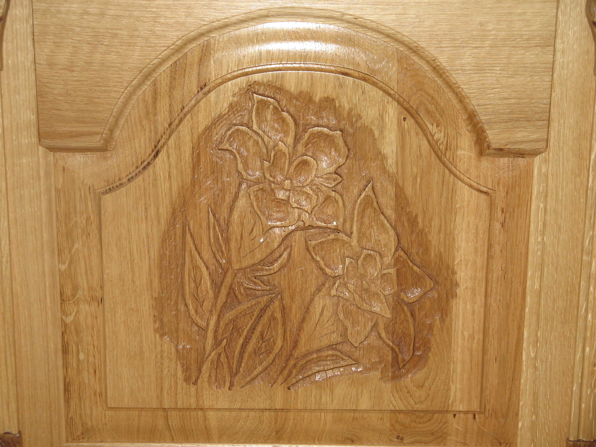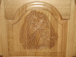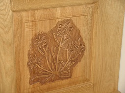 ![]() Truhe mit handgeschnitzten Füllungen aus Eiche, rechte Füllung Enzian. |