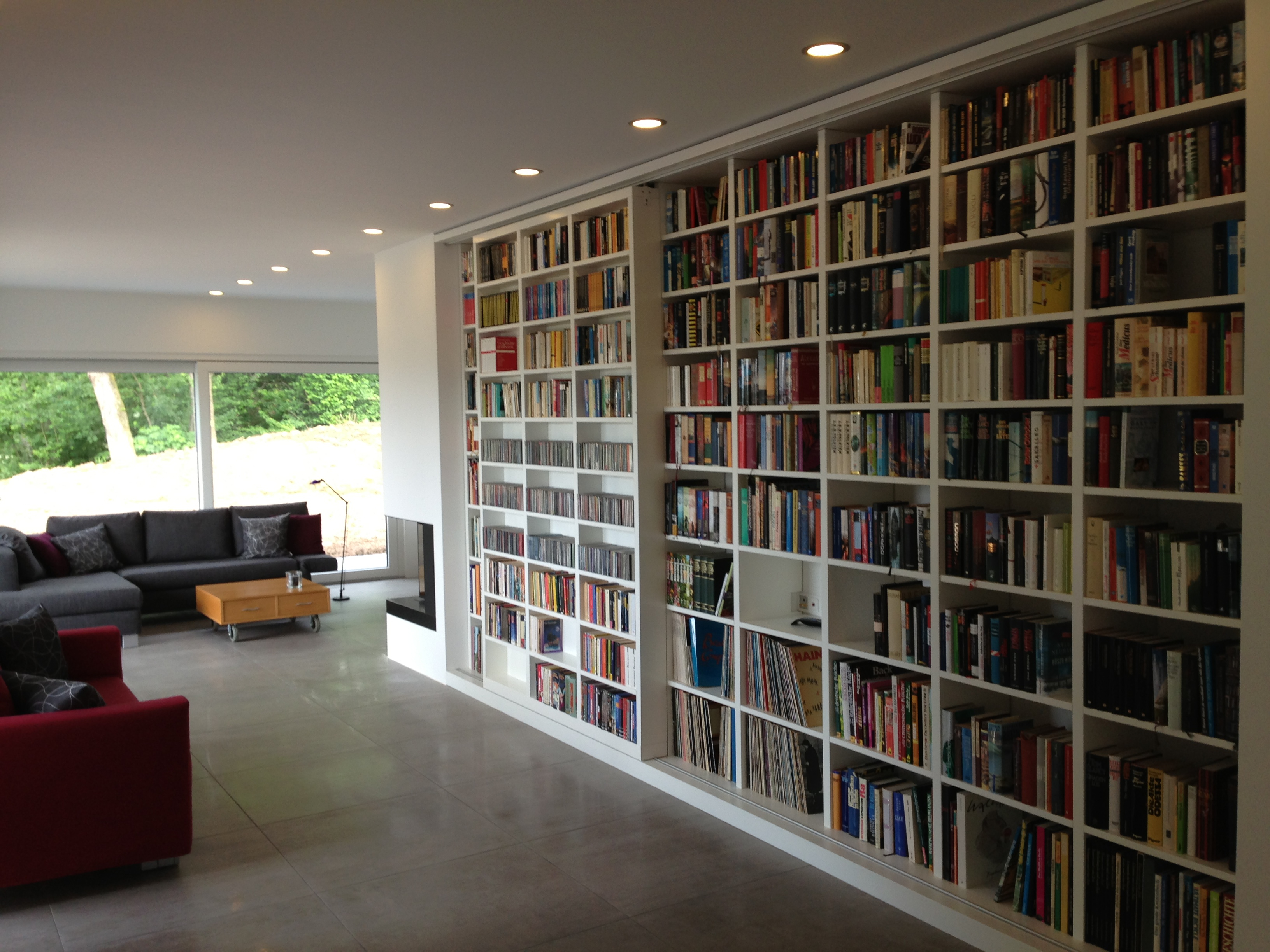 ![]() Einbaubücherregal mit verschiebbaren Vorderteil in Weißlack, befüllt. |