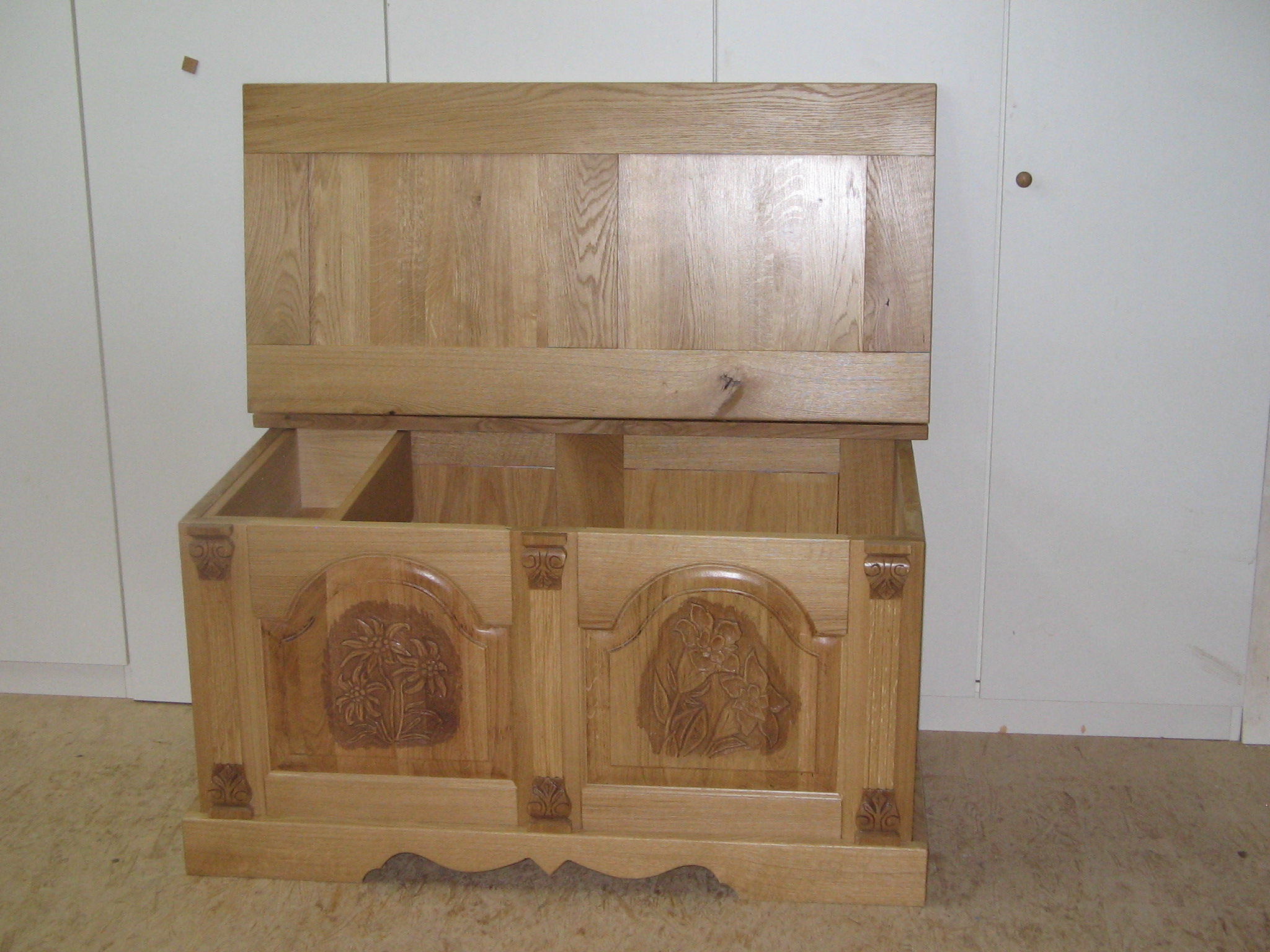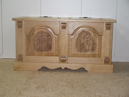 ![]() Truhe mit handgeschnitzten Füllungen aus Eiche. |