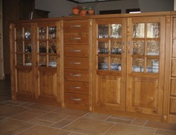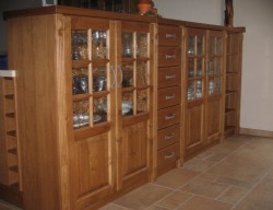 Geschirrschrank aus Eiche bestehend aus zwei Schränken mit Türen mit Glasausschnitt und zentralem Schubkastenschrank |