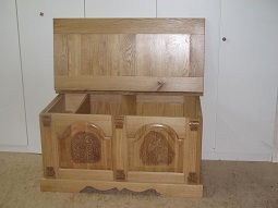 ![]() Truhe mit handgeschnitzten Füllungen aus Eiche offen. |